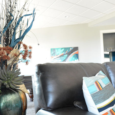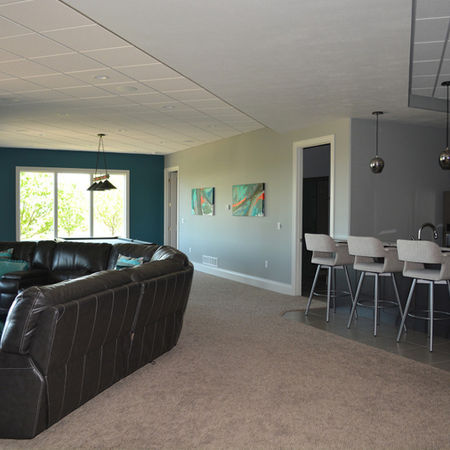 This basement family room was part of a whole home new construction. It really is the ultimate hangout space with a large sectional, gaming area, and bar. Adding bold pops of teal and orange added a fun dose of color throughout the space.