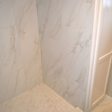 Classic and timeless with textures of white. This bathroom went from blue tile and busy wallpaper, to layers of grey and white.
